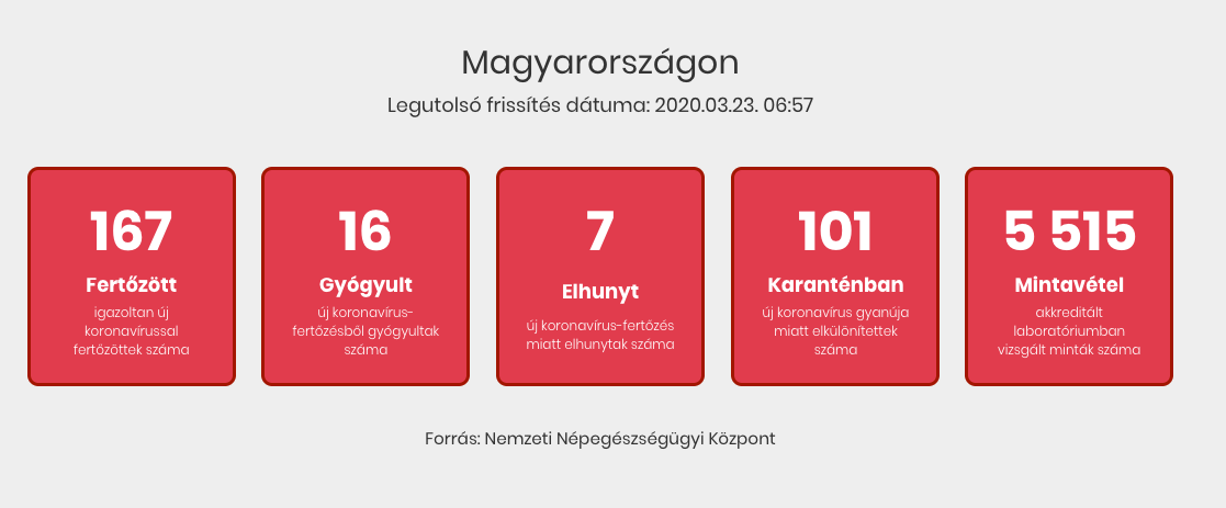 Újabb magyar állampolgároknál mutatták ki az új koronavírus-fertőzést (COVID-19), ezzel 167-re nőtt a hazánkban beazonosított fertőzöttek száma és újabb idős, krónikus betegségben szenvedő férfi hunyt el.