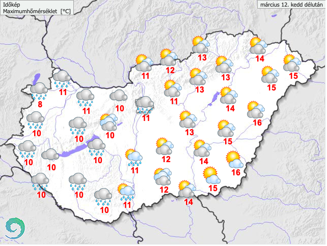 A legmagasabb nappali hőmérséklet általában 9 és 14 fok között várható, de a naposabb tiszántúli vidékeken 16, 17 fok is lehet. Késő estére 5, 10 fok közé hűl le a levegő.