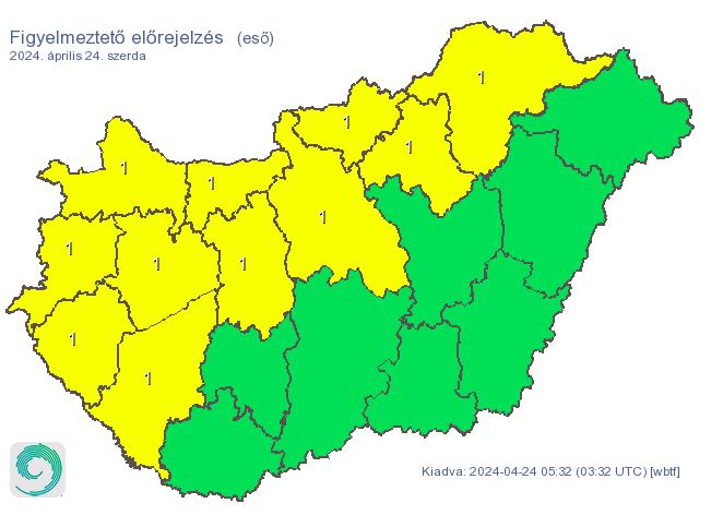 A HungaroMet szerdán hajnalban frissítette az előrejelzését és riasztását. Ebből derül ki, hogy egy dél felöl érkező cinklon miatt ma országszerte bárhol várható eső. "Ennek mennyisége az ország északnyugati felén, főként a Dunántúl északnyugati, nyugati részein illetve az Északi-Középhegység területén, valamint Pest megye északi felében több helyen is elérheti, meghaladhatja a 20-25 mm-t, a nyugati határ környezetében akár a 30 mm-t is" - írja a Met.hu.
