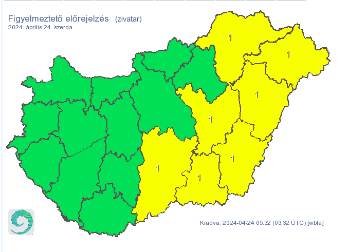 11 vármegyére eső, 7 vármegyére zivatarok miatt adtak ki riasztást. De heves, viharos széllökések és jégeső is lehet.