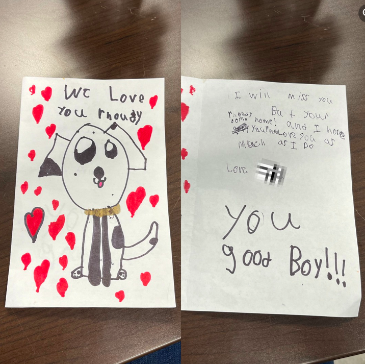"Hiányozni fogsz" - írta az egyik gyerek a Rhoudynak címzett papírlapra, majd: "Szeretünk téged, Rhoudy."