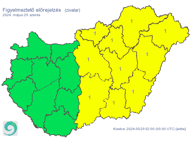 "Északkeleten, illetve a Tiszántúlon néhol felhőszakadás-szerű csapadékintenzitással lokálisan jelentősebb mennyiségű csapadék is (20-30 mm) hullhat" - írja a HungaroMet, majd hozzáteszik: a zivatarok környezetében helyenként viharos széllökés (55-65 km/h) előfordulhat, nagyobb eséllyel a terület északkeleti harmadában (Borsod, Szabolcs, Hajdu megye) délután.