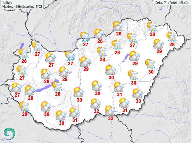 A legmagasabb nappali hőmérséklet 26 és 33 fok között valószínű. Késő estére 16 és 24 fok közé hűl le a levegő.