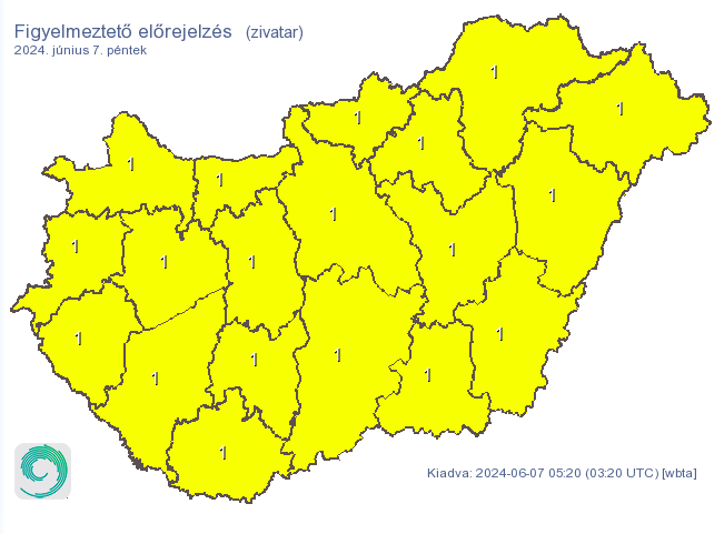 Az egász országra riasztást adtak ki zivatarok miatt.