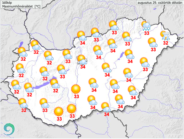 A HungaroMet friss előrejelzése szerint ma legfeljebb a nyugati megyékben, illetve északkeleten néhány helyen helyen alakulhat ki zápor, esetleg zivatar. "Az északkeleti, keleti szél a Dunától keletre megélénkül. A legmagasabb nappali hőmérséklet 32 és 36 fok között alakul. Késő estére 22 és 29 fok közé hűl le a levegő" - írják.