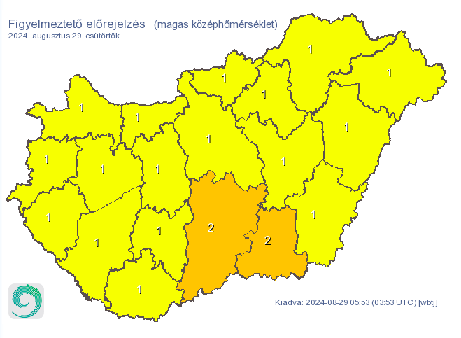 A meteorológiai szolgálat ugyanakkor az egész országra figyelmeztetést adott ki a hőség miatt. Két vármegyére másodfokút. "Ma az északi határszél kivételével 25 fok feletti, az Alföldön 27 fok körüli vagy afeletti napi középhőmérséklet valószínű" - írják.