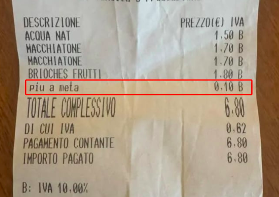 A Corriere del Veneto beszámolója szerint a dühös vásárló a közösségi médiában fejezte ki nemtetszését. Az olasz nő július végén az anyjával reggelizett együtt az „Audrey Patisserie” nevű cukrászdában Oderzóban. A pultnál a vendég két tejeskávét, egy vizet és egy croissant-t rendelt, de megkérte a pincéreket, hogy a péksüteményt vágják ketté – ami meg is történt. Aztán megdöbbent. Otthon ugyanis megnézte a blokkot, és rájött, hogy a cukrászda 10 euró centet számított fel neki csak azért, hogy kettévágták a croissant-t. A vendég szerint ez „brutális felár”. A blokkról egy képet is posztolt.