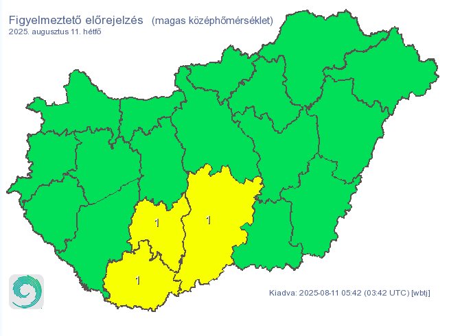 Még nincs vége:3 vármegyére frissítették a riasztást hétfőre 2025. 08. 11. 06:45 Megosztom Facebookon A meteorológiai szolgálat friss előrejelzése szerint hétfőn délnyugaton, délen a napi átlaghőmérséklet 25 fok körül alakul.Három vármegyére adtak ki elsőfokú riasztást - Tolnára, Baranyára és Bács-Kiskunra: Fotó: Met.hu Címlapfotó: 123rf.com riasztás hőség időjárás