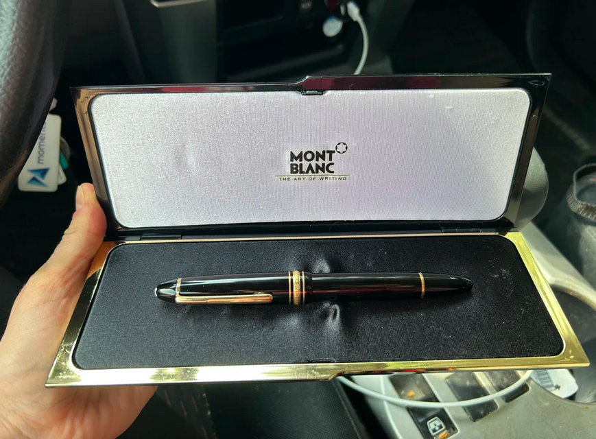 A második képen máris a zsákmány látható: a tokban a MountBlanc luxusmárka egy töltőtollja rejtőzött. „Bementem, hogy vegyek egy ékszerdobozt, és egy Montblanc tollat találtam 0,99 dollárért” – írta a vintage rajongó a bejegyzéshez.