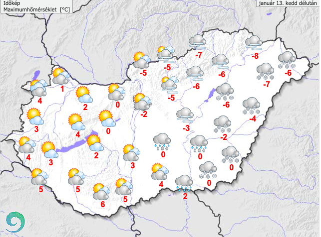 A legmagasabb nappali hőmérséklet -8 és +7 fok között alakul, délnyugatról északkelet felé haladva számíthatunk az egyre alacsonyabb értékekre. Késő estére többnyire -10 és -1 fok közé hűl a levegő.