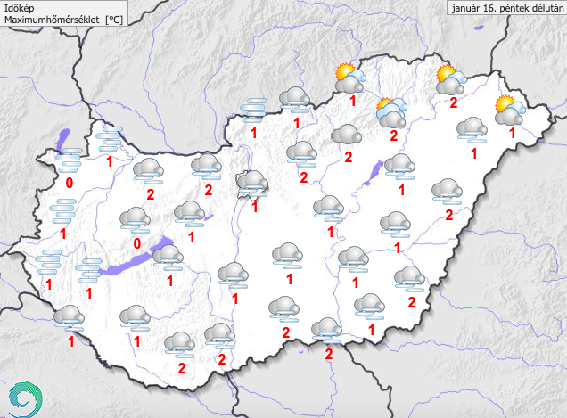 A hőmérséklet kora délután általában -2 és +3 fok között alakul, de délnyugaton néhol ennél több fokkal melegebb is lehet. Késő este -5, +2 fok valószínű.