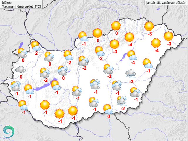A csúcshőmérséklet -5 és +2 fok között valószínű. Késő estére -14 és -3 fok közé hűl le a levegő.