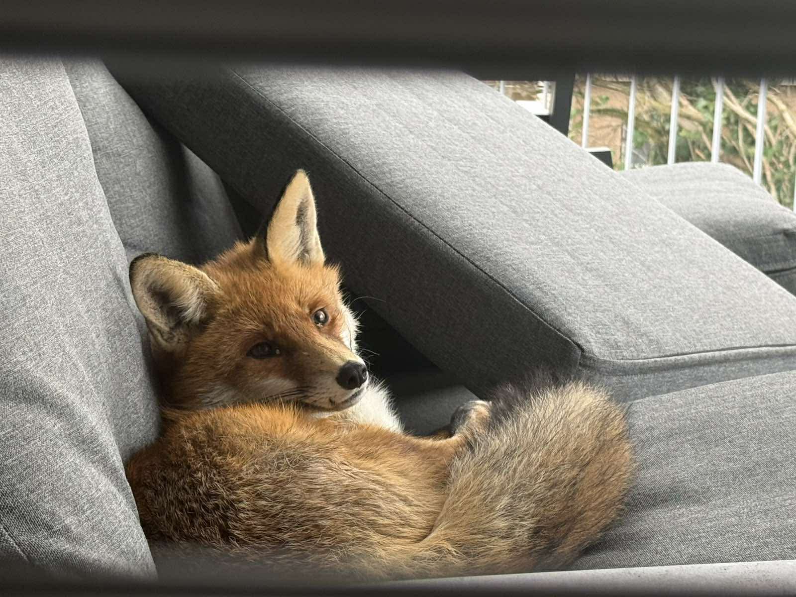 Lúcia az Insta-történetében osztott eg egy képet: egy teraszon lévő kanapén egy méretes, de meglehetősen békésnek tűnő róka alszik.