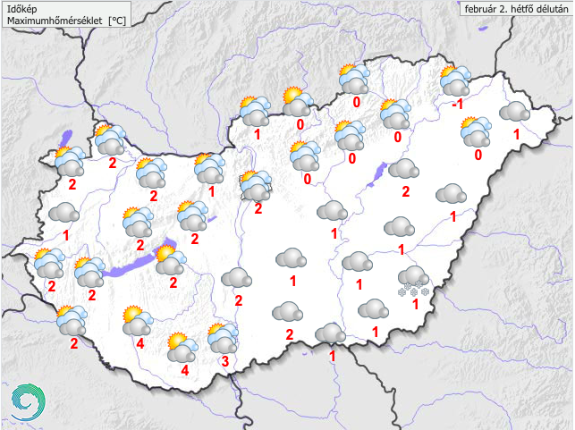 Febuár első hétköznapján túlnyomóan borult, párás idő várható, majd a nap második felében elkezdhet szakadozgatni a felhőzet. "A déli órákig elszórtan fordulhat elő hószállingózás, kisebb havazás, délelőtt a Dunántúlon helyenként havas eső, gyenge eső sem kizárt. Estétől a Dunántúlon élénkülhet meg a déliesre forduló légmozgás - írja a meteorológiai szolgálat.