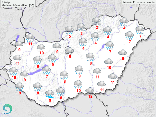A HungaroMet szerint a délies szelet élénk, helyenként erős lökések kísérhetik. A legmagasabb nappali hőmérséklet nagyrészt 6 és 13 fok között alakul, de az Északi-középhegység térségében több fokkal hidegebb maradhat az idő. Késő estére 1 és 8 fok közé csökken a hőmérséklet.