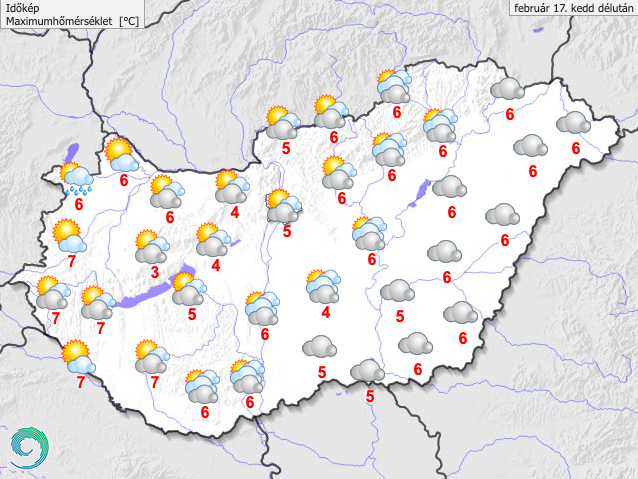 A legmagasabb nappali hőmérséklet délután 3 és 8 fok között valószínű. Késő estére -2 és +3 fok közé csökken a hőmérséklet.