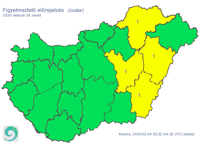 70 km/h-s szél, zivatarok és jég: 4 vármegyére frissítették a riasztást 2026. 02. 24. 06:40 Megosztom Facebookon "Ma a délutáni órákban a keleti megyékben egy összeáramlási zóna mentén előfordulhatnak zivatarok, melyeket viharos széllökés (~60-70 km/h) és apró szemű jégeső kísérhet" - írja veszélyjelzésében a meteorológiai szolgálat. 4 vármegyére adtak ki riasztást: Fotó: Met.hu Címlapfotó: 123rf.com zivatar időjárás riasztás