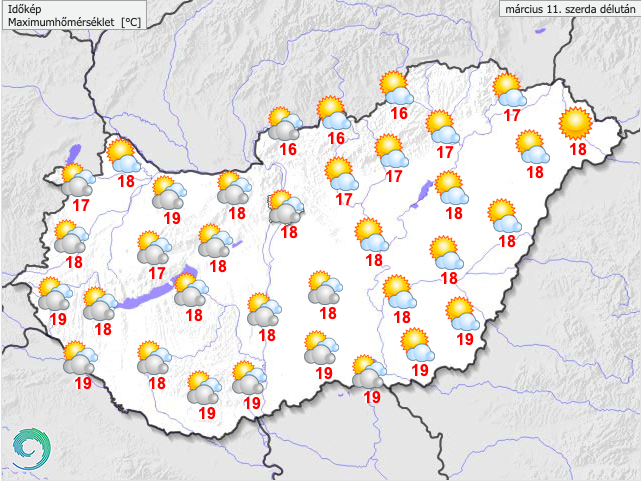 A legmagasabb nappali hőmérséklet döntően 15 és 19 fok között valószínű. Késő este többnyire 3 és 11 fok közötti értékek várhatók.